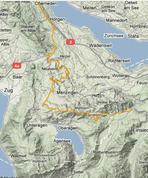 Zuerst geht es mit dem Zug nach Wädenswil und dann nach Biberbrugg. Von dort aus startet man Richtung Gutschwald - Gottschalkenberg (1254 m.ü.M.) Der Aufstieg ist sehr angenehm. Weiter geht es an schönen Singletrails wieder runter auf 585 m.ü.M. - Muetegg - Fürschwald - Gubel - Menzingen - Sihlmatt - Sihlsprung. Die Strecke bei Menzingen führt am ehemaligen Raketenabwehrsystem Bloodhood und am Kloster vorbei. Der Trail entlang der Sihl ist wunderschön. Bei Sihlbrugg ist es für eine kurze Zeit vorbei mit der Ruhe, bis man wieder steil rauf Richtung Höhi - Zimmerberg strampelt. Auf dem Zimmerberg (ca. 800m.ü.M.) hat man dann endlich den 2. Aufstieg geschafft. Von da an geht es nur noch runter Richtung Oberrieden. Da sind wir dann wieder auf den Zug gesprungen, die Strecke kann aber noch weiter bis Zürich Stadt gefahren werden.