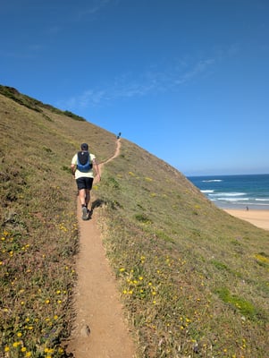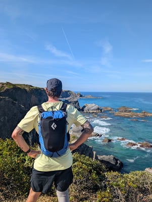 Anfang Mai flogen wir von Basel nach Lissabon, mit nichts als dem Nötigsten im Gepäck: je ein Trailrunning-Rucksack, maximal 4 kg schwer. Klare Sache – weniger ist mehr. Eine Nacht in der Hauptstadt reichte, um das vertraute Lissabon noch einmal aufzusaugen. Danach ging es mit dem Bus weiter nach Porto Covo, dem Startpunkt unserer kleinen Abenteuerreise.